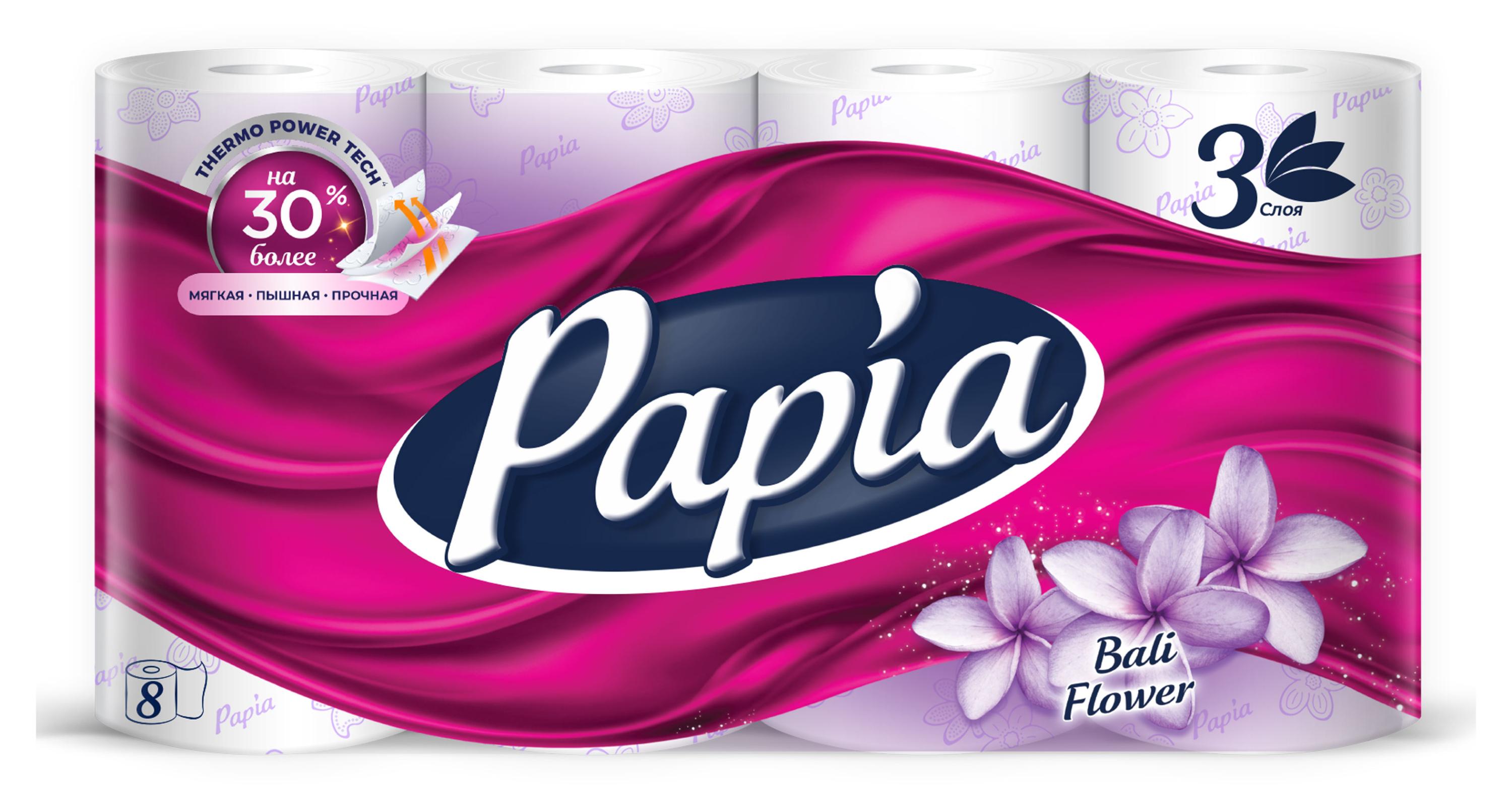 Туалетная бумага Papia Bali Flower белая 3 слоя, 8 рулонов