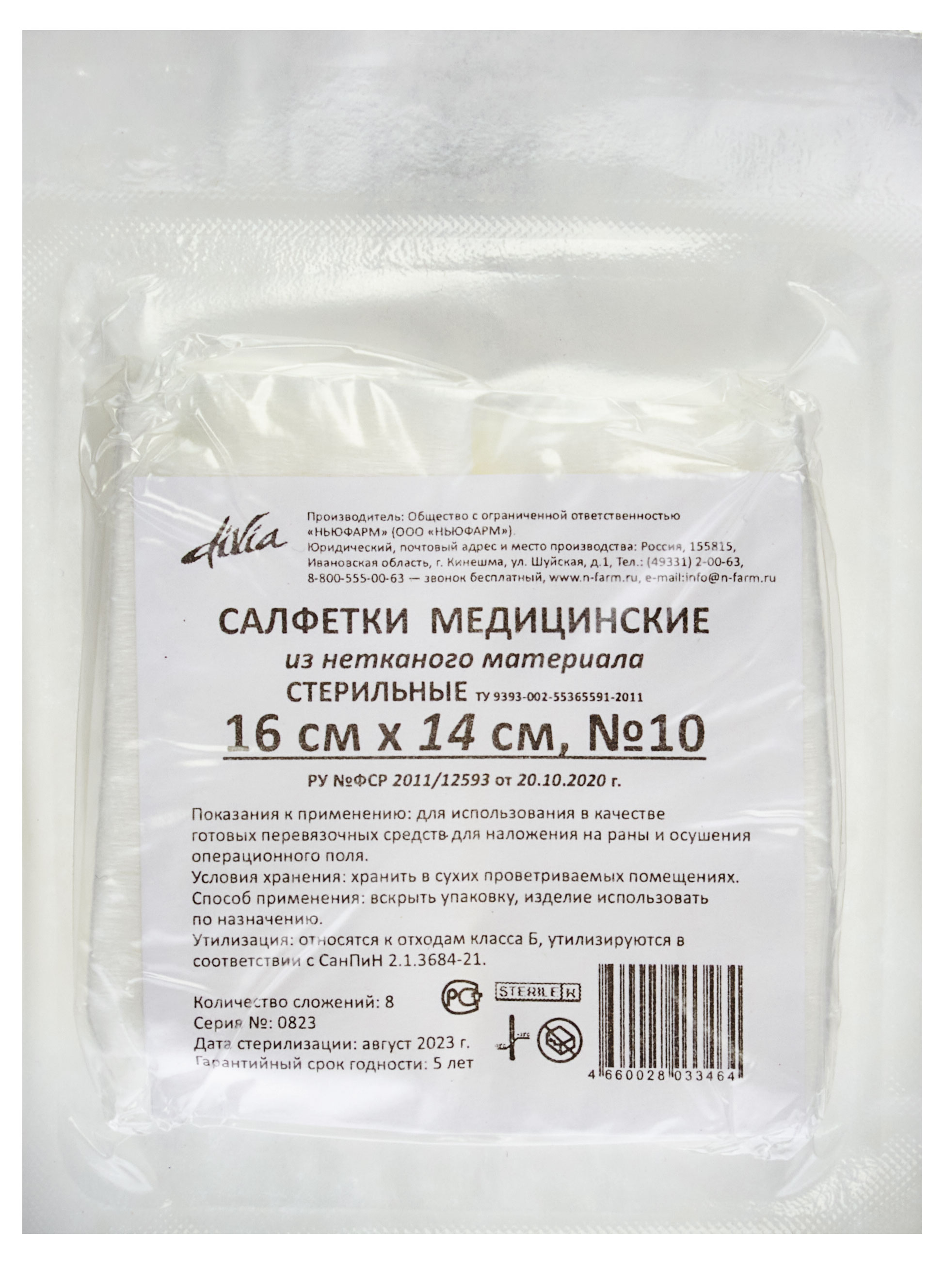 Салфетки медицинские из нетканого материала стерильные 8 сложений 16х14см №10