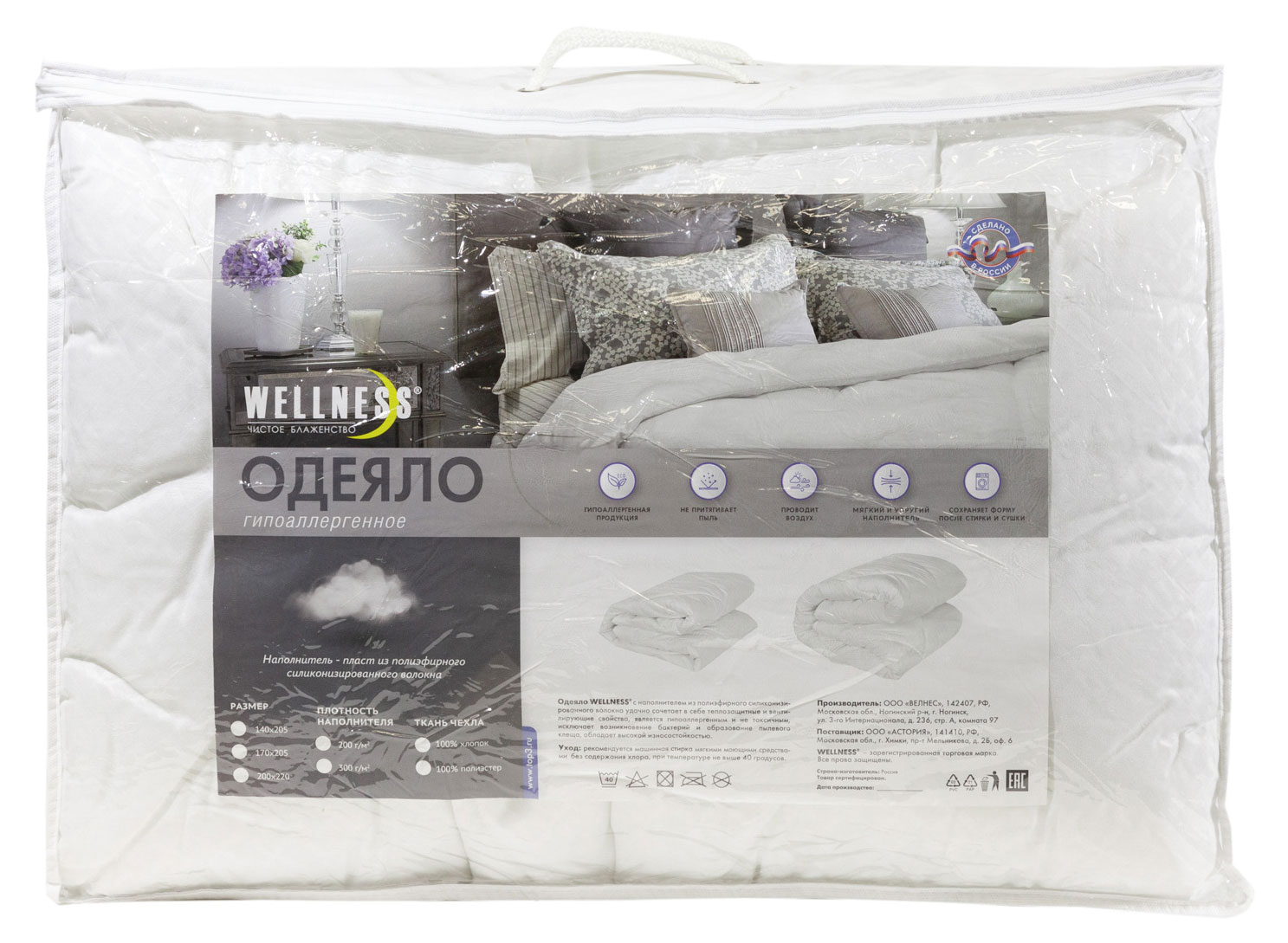 Одеяло белое 1,5-спальное Wellness, 140х205 см производится с наполнителем из полого силиконизированного волокна импортного производства. Полый полиэстер в виде пласта состоит из скрепленных между собой полых волокон, между которыми возможно прохождение воздуха, что позволяет одеялу дышать, а специальная обработка волокон делает их ещ более долговечными и близкими по свойствам к натуральному пуху. Несмотря на свою мягкость, полиэстер - упругий материал, который прекрасно держит форму, а после сжатия восстанавливает объем практически мгновенно. Одеяла из этого наполнителя подлежат стирке в бытовой автоматической стиральной машине, и это, благодаря специфической обработке одеял, практически не влияет на их свойства.