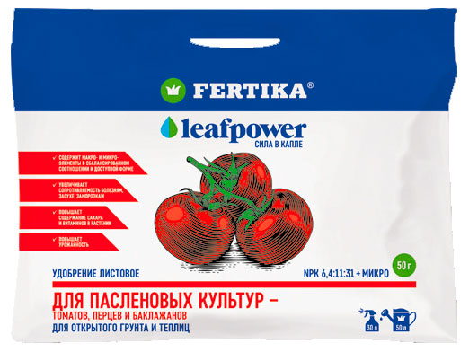 Удобрение Fertika Leaf Power для пасленовых культур, 50 г имеет хорошо сбалансированный макро- и микроэлементный состав для использования при выращивании всех культур семейства пасленовых, в том числе томатов, перца и баклажанов, в открытом грунте и теплицах. Полностью водорастворимое комплексное азотно-фосфорно-калийное удобрение, содержащее микроэлементы. Имеет хорошо сбалансированный макро- и микроэлементный состав для использования при выращивании всех культур семейства пасленовых, в том числе томатов, перца и баклажанов, в открытом грунте и теплицах. Повышает урожайность, а также качество плодов. Применяется в виде водного раствора, как под корень, так и в качестве листовой подкормки в течение периода вегетации растений.