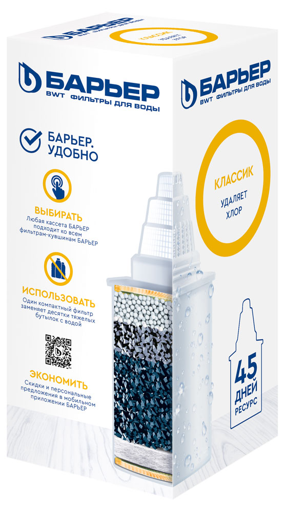 Кассета сменная к фильтру-кувшину для очистки воды «Барьер» Классик осуществляет базовую очистку водопроводной воды от железа, хлора и других вредных примесей, а так же удаляет посторонние привкусы и запахи. Кассета имеет с рабочий ресурс до 200 литров. Резьба на кассете не позволяет попасть нефильтрованной воде в кувшин. В упаковке находится одна кассета, подходящая к любому фильтру-кувшину «Барьер». Один компактный фильтр заменяет десятки тяжелых бутылок с водой. Срок годности 3 года.