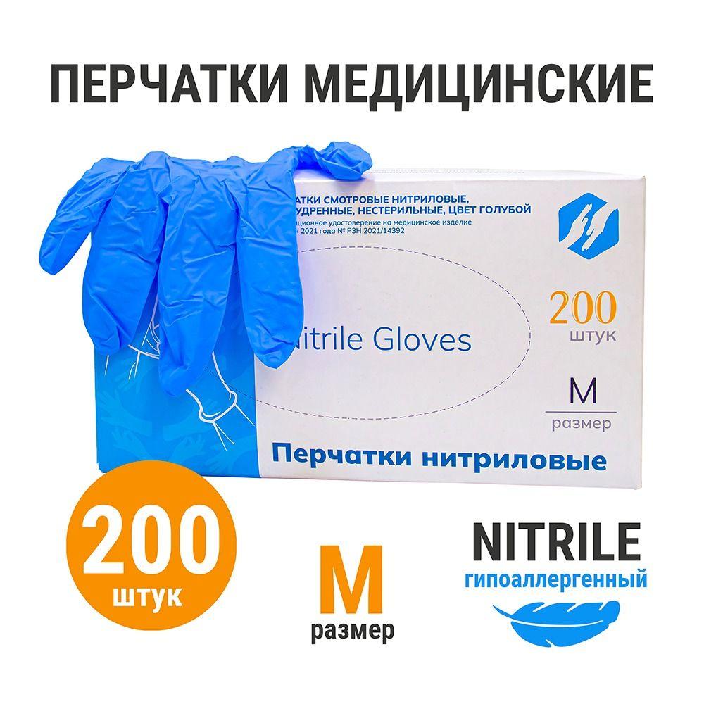 Одноразовые медицинские перчатки нитриловые смотровые текстурированные/ 200 шт., 100 пар/ Размер М / Цвет голубой.