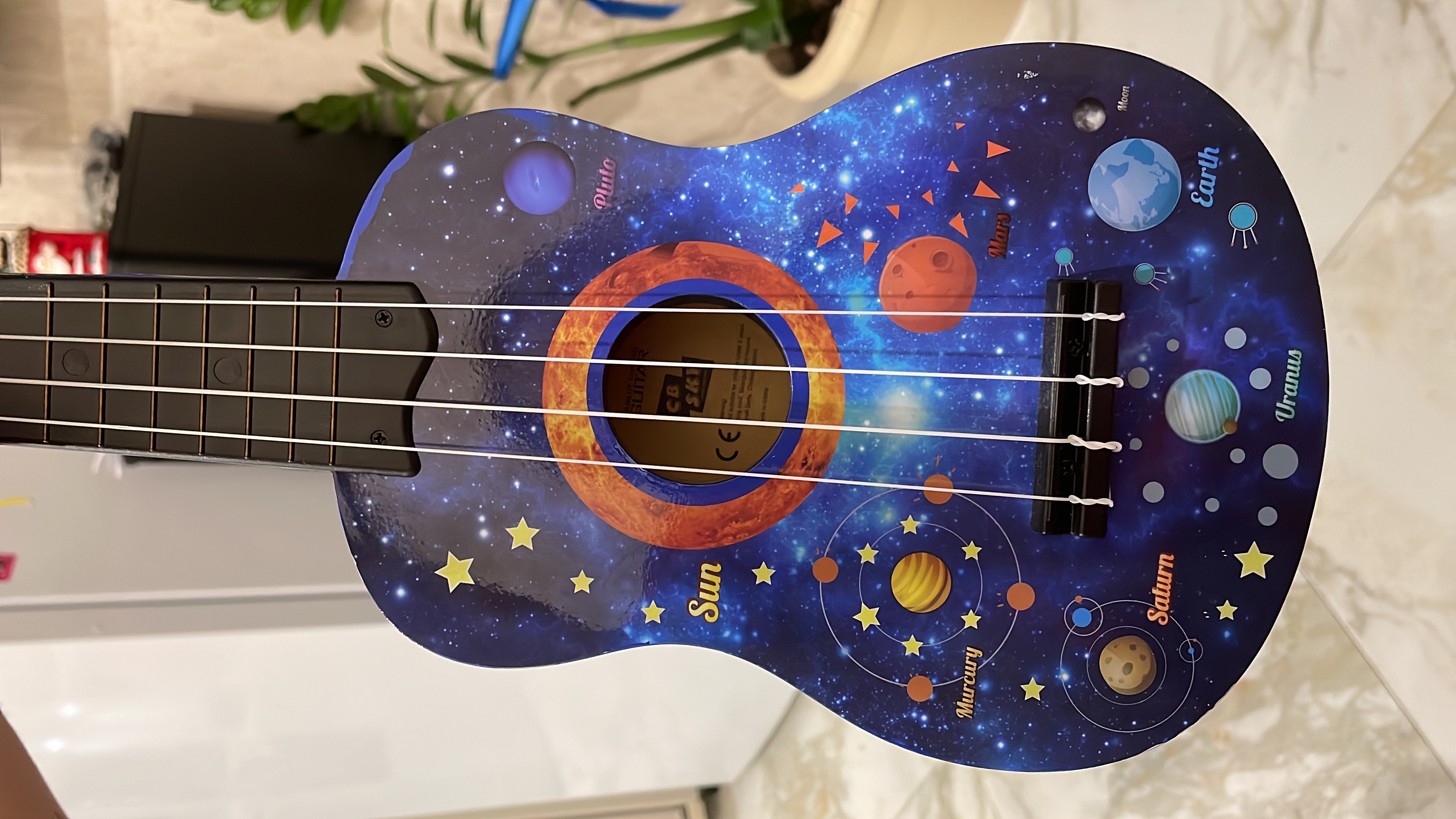 - Красивый дизайн: гитара с космическими рисунками привлечет внимание ребенка.