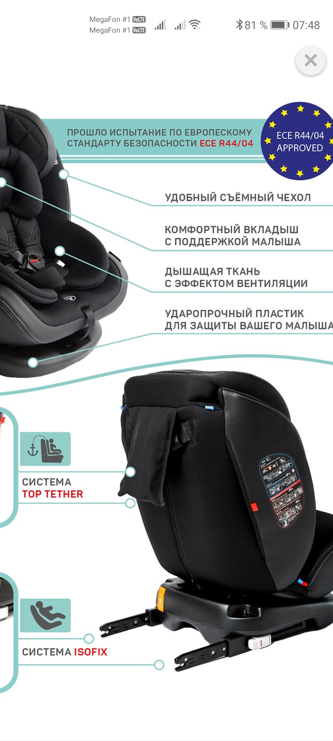 Универсальное кресло для детей от рождения до 12 лет Вес ребенка: до 36 кг Современный дизайн, стильные формы и лаконичные детали Установка кресла с помощью системы креплений Isofix или 3-х точечного ремня безопасности Дополнительная якорная система крепления - Top Tether Мягкий анатомический вкладыш для перевозки детей до года и дополнительные защитные накладки на ремнях безопасности Три уровня наклона кресла и дополнительная боковая защита Функция поворота кресла на 360 градусов Регулировка натяжения ремней Регулируемая высота подголовника Съемный чехол и возможность стирки Материал: каркас - пластик, ткань - полиэстер Габариты автокресла: размер сиденья (ДхШ): 27х35 см