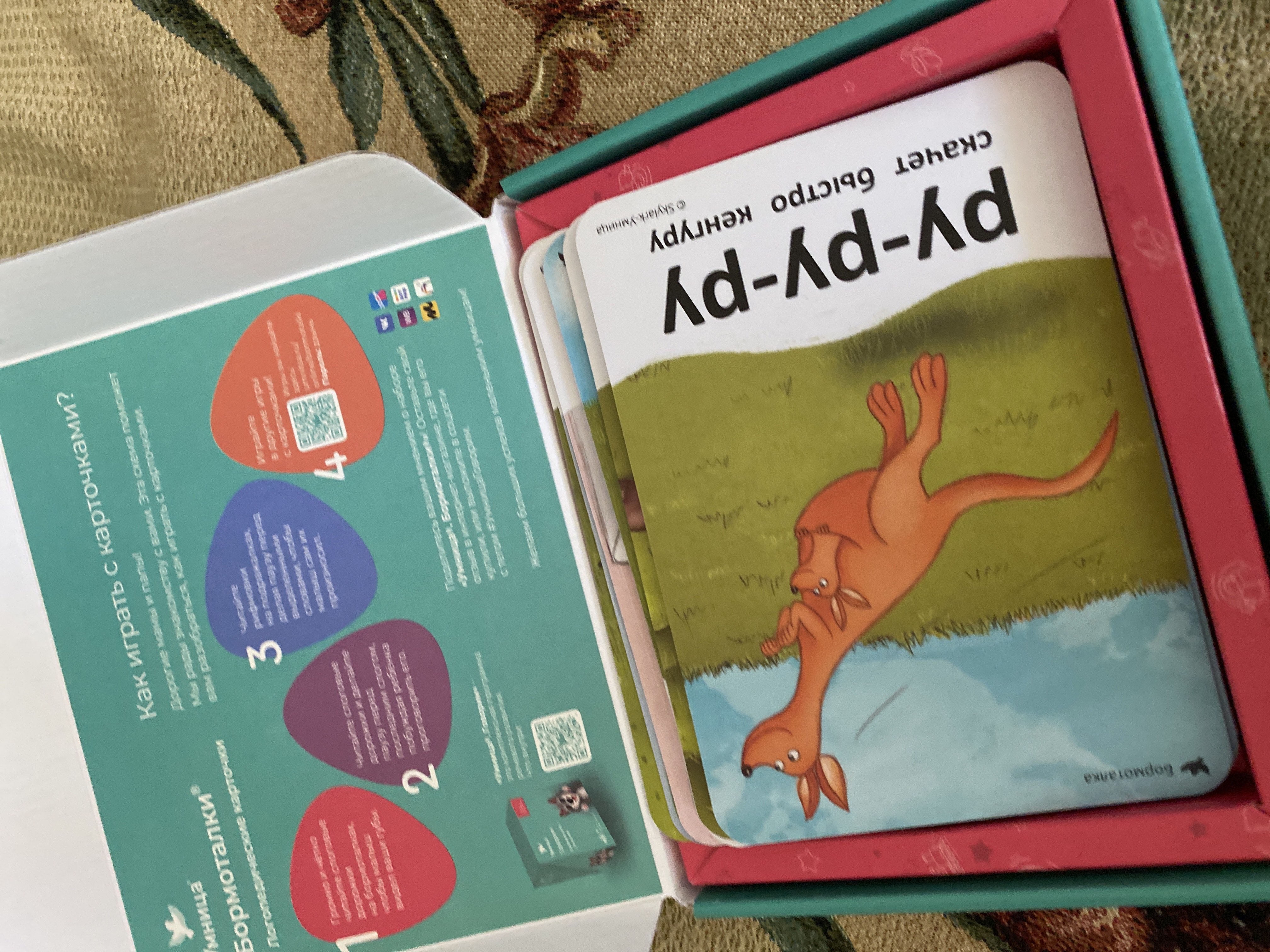 Карточки для развития речи и логопедические игры для детей в одном наборе! Бормоталки® с кенгуру от Умницы® - это качественные развивающие карточки для детей от года, разработанные практикующими логопедами. Они гораздо эффективнее и полезнее для развития ребёнка, чем карточки Домана. С их помощью мы развиваем речь малыша в ненавязчивой игровой форме. Всего в наборе 32 двусторонние карточки. Они содержат милые современные иллюстрации, звукоподражания, авторские слоговые дорожки и стихи, посвящённые объекту на картинке. Сначала ребёнок будет рассматривать яркие картинкина карточках и слушать вашу речь. Затем начнёт осваивать звукоподражания и повторять части слоговых дорожек. А позже сможет сам проговаривать даже сложные звуки, заканчивать стихи, воспроизводить их по памяти. Если тратить на такие логопедические занятия по карточкам всего несколько минут в день, развитие речи у дошкольников происходит эффективно и легко. Ребёнок учится произносить сложные звуки, его речь становится правильной и красивой. В итоге занятий: