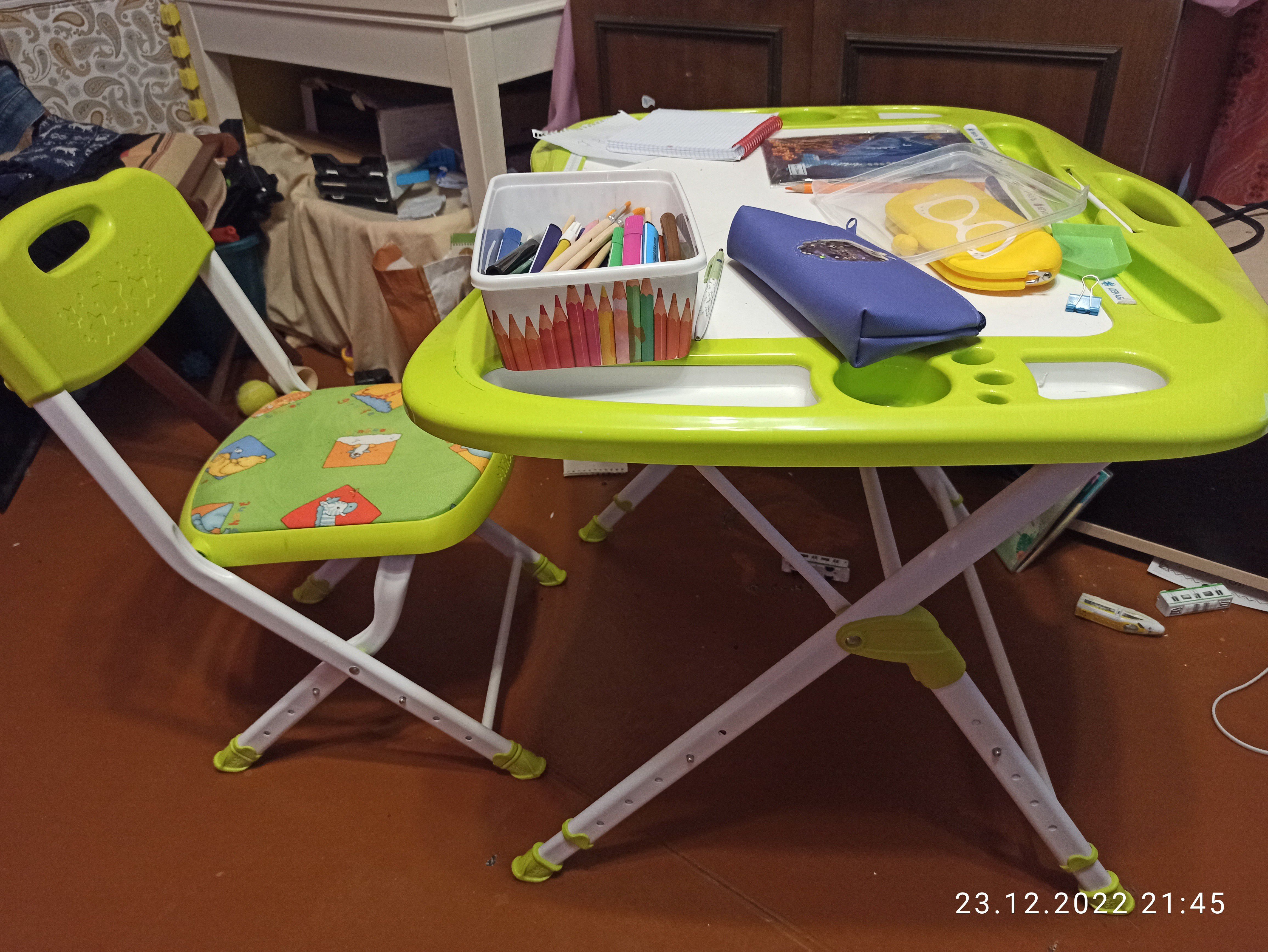 Качественные и безопасные материалыВсе изделия комплекта изготовлены из качественных и безопасных материалов. Каркасы столика и стула выполнены из прочного пластика и металла, обеспечивая надежность и долговечность мебели. Столешница изготовлена из ЛДСП, что обеспечивает прочность и устойчивость к повреждениям.