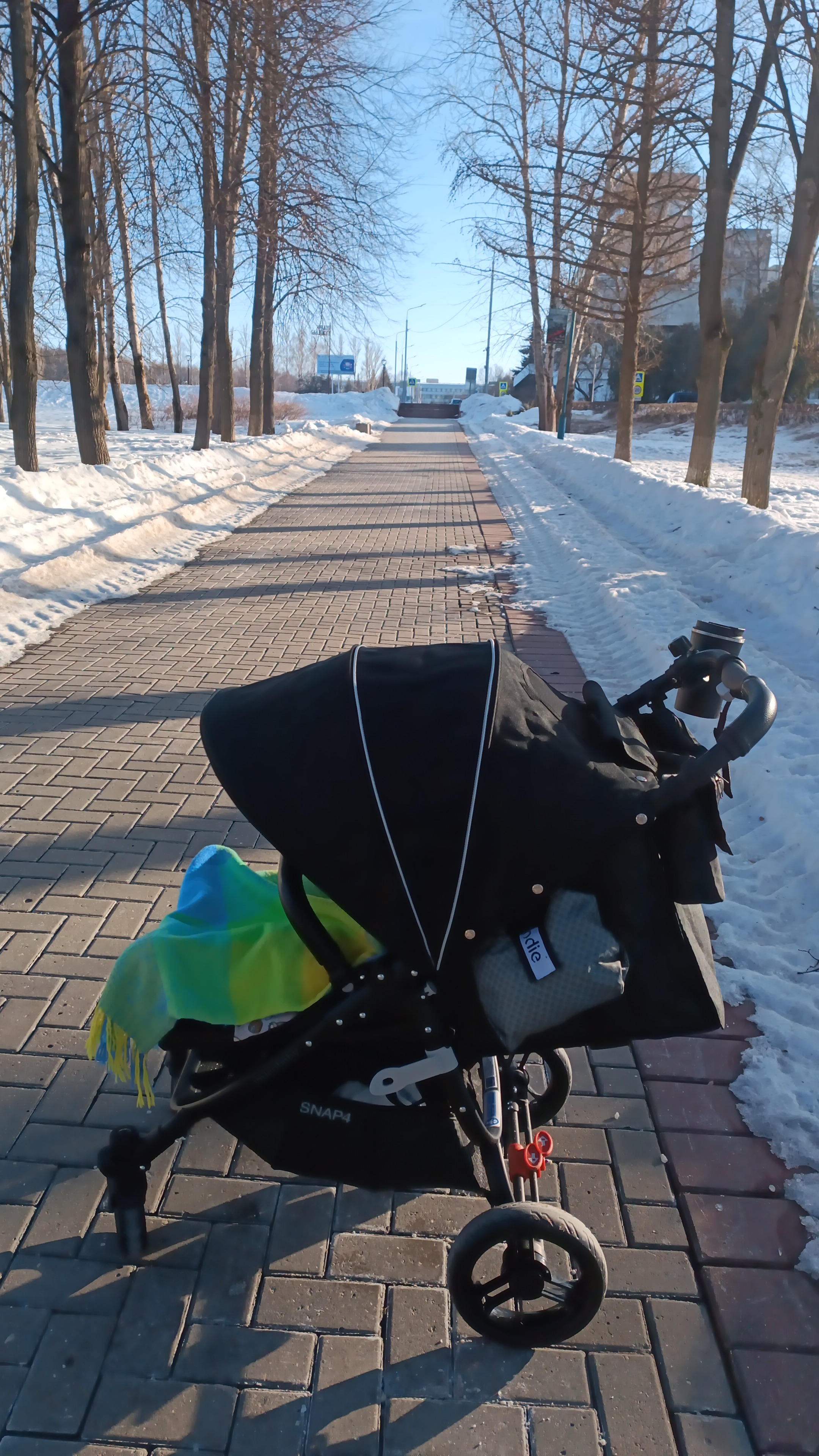 Модель Snap 4 имеет четыре полиуретановых колеса, которые не боятся проколов. Два передних колеса могут вращаться на 360°, это увеличивает манёвренность коляски при движении по ровной дороге. Если же на пути часто возникают препятствия, колёса лучше зафиксировать. Для этого над каждым из них имеется специальный рычажок. Задние колёса оснащены стояночным тормозом, педаль которого расположена по центру задней оси. На педали хорошо видна маркировка в виде закрытого и открытого замка. Устройство педали хорошо продумано и позволяет снимать коляску с тормоза, не испортив обувь.