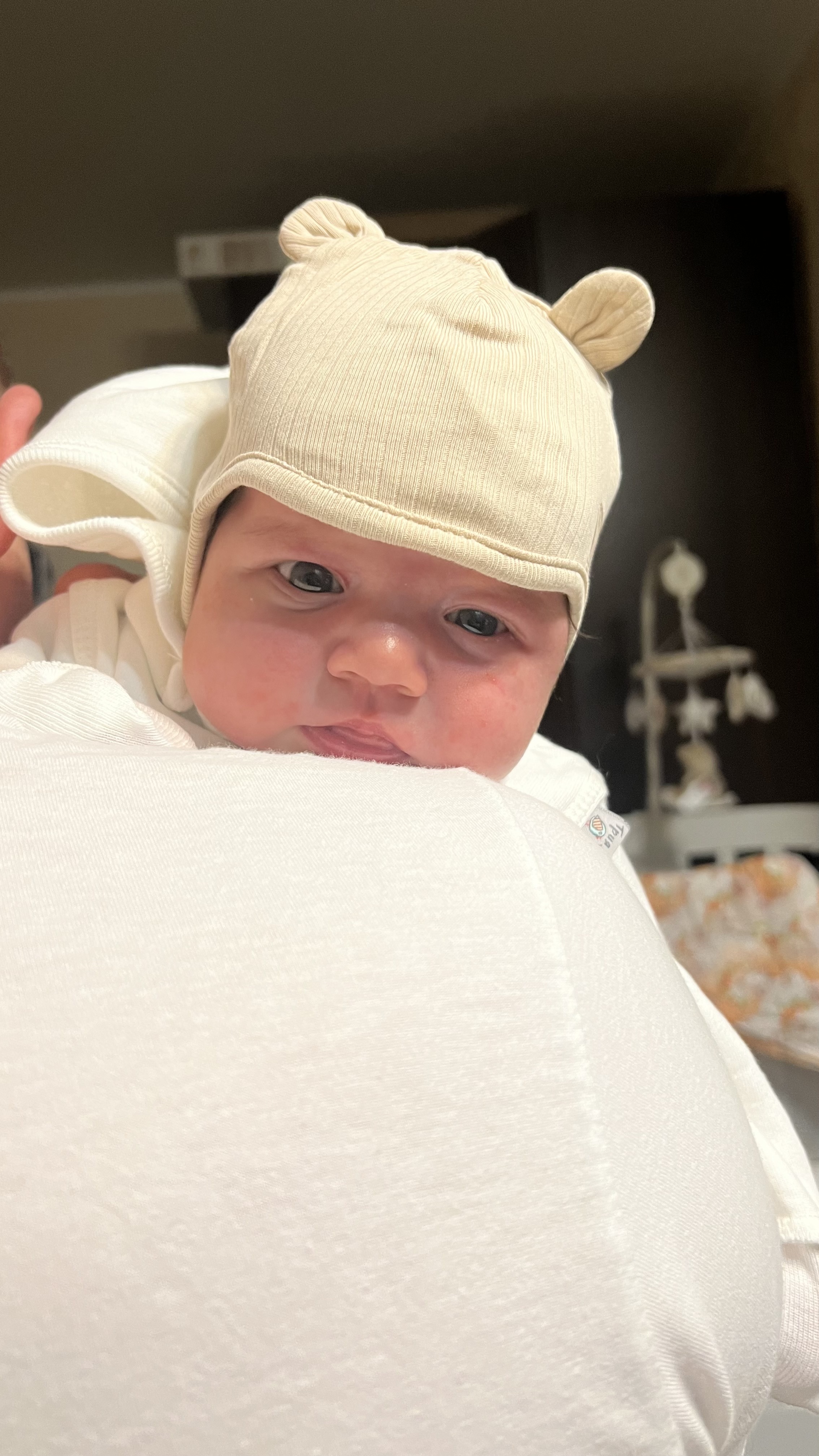 Бежевая шапочка для малыша "Моя Горошинка" на завязках, с ушками. Выполнена из 100% хлопка, не вызывает раздражения и аллергии. Декорирована нашивкой.