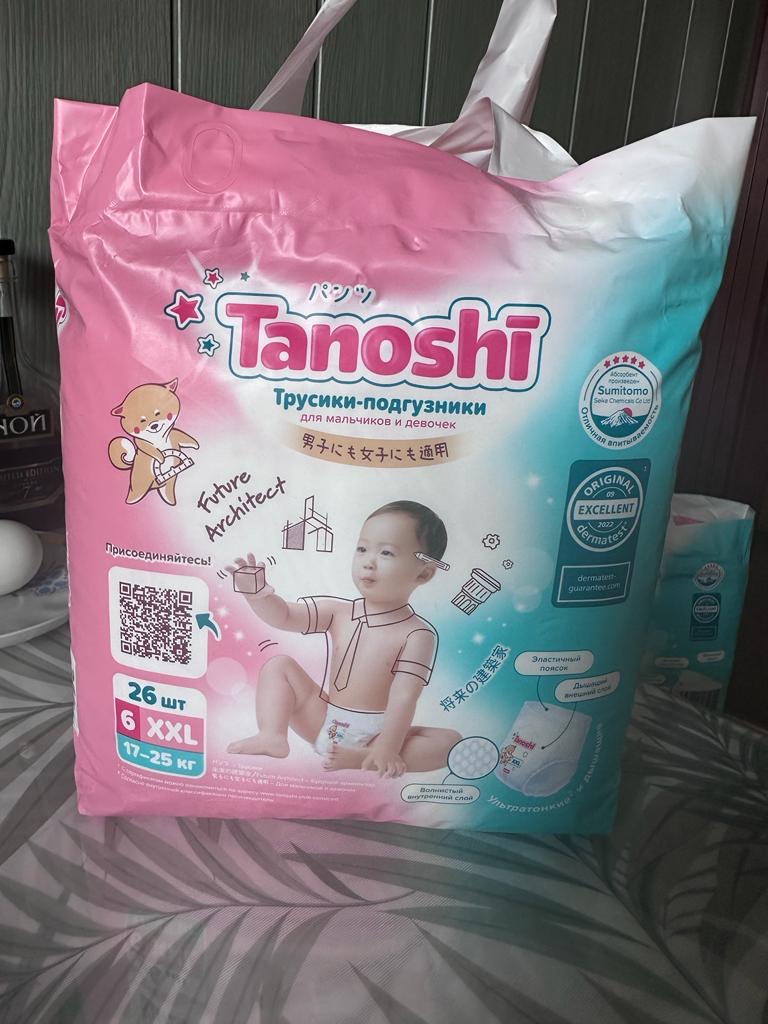 Недостатки продукта Подгузники-трусики Tanoshi XXL 17-25кг 26шт Недостаточный размер для некоторых детейЕсть отзывы о том, что размеры XL и XXL могут показаться одинаковыми или быть маломерными для детей определенного весового категории. Некоторые пользователи замечали разрывы по бокам из-за этого.