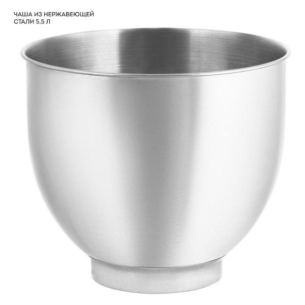 Индикация: включения, режима работы,Потребляемая мощность: 1600 Вт,Объем чаши: 5.5 л,Количество скоростей: 6,Импульсный режим работы: Да,Плавный запуск двигателя: Да,Отключение при перегреве: Да,Количество крюков для замеса теста: 1 шт,Количество венчиков для взбивания: 1 шт,Количество насадок: 6 шт