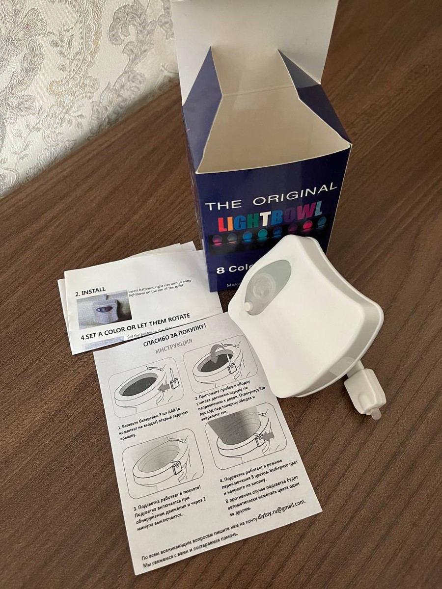 Умный ночник для ванной, подсветка для унитаза с датчиком движения - очень полезный товар для дома. Еще одна разновидность декоративного освещения туалета, ванной комнаты, прихожей, кладовой. Подходит для декора аквариумов, кувшинов, ваз, картин, фонтанов, водопадов, предметов интерьера и т.д.Креативный ночник RGB (светильник Led) поможет создать нужную атмосферу в спальне или гостиной, добавляя элегантности и удивительного праздничного волшебства даже на самых скучных поверхностях. Обычный белый унитаз превращается в цветной. Управление и выбор нужного света позволит создать ту обстановку, которая подойдет именно вам.Подсветка может быть использована в качестве необычного подарка для ребенка, близкого человека, хороший прикольный подарок на День Рождения, Новый год, 8 марта, 23 февраля, День Святого Валентина 14 февраля, годовщину, юбилей и просто сюрприз для поднятия настроения.Ночью не нужно искать выключатель, включать свет, зажмуривать глаза. LED и RGB лампа подсветки в туалете, ванной включается автоматически только тогда, когда заходите в темное помещение, так как есть встроенный датчик движения и освещенности. Вы сможете выбрать один цвет включения или активировать поочередную автоматическую смену цветов.Важное преимущество светильника с датчиком движения на батарейках для дома беспроводной 8 цветов - это беспроводная работа без необходимости постоянного подключения к розетке 220 или зарядке от USB-кабеля 5 вольт.Подсветка для туалета может быть установлена непосредственно на унитазе, благодаря своей герметичности. Питается от трех батареек AAA (в комплект не входят). Так же работает от аккумулятора и подходит на любой домашний, офисный, умный, портативный, детский унитаз, раковину или аквариум. На подсветке присутствует кнопка переключения режимов работы и цвета.