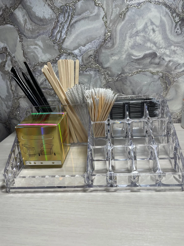 Многофункциональный дизайнОрганайзер выполнен из прозрачного акрила и оснащен специальными отсеками и ячейками различных форм и размеров. В нем есть 16 вместительных ячеек разного размера, из которых 12 предназначены для лаков и помад, а 4 являются универсальными. Благодаря этому, вы сможете легко разместить в органайзере предметы для красоты и макияжа, такие как помада для губ, тушь, пилки и апельсиновые палочки, лаки для ногтей и кисточки.