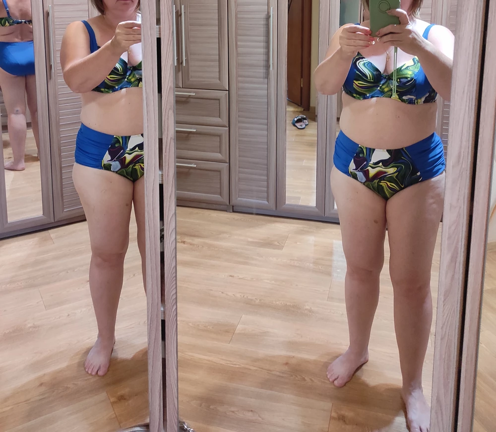 Конструкция бюста - мягкая чашка на каркасах. В боковых деталях использованы пластины упругости. Внутренняя боковая поверхность чашки дублирована неэластичной сеткой, что позволяет иметь в большом размере идеальную посадку. Плавки выше средней линии талии, легкая драпировка в боковых элементах визуально корректирует силуэт фигуры. Интересная находка дизайнеров - яркий красочный акварельный принт в сочетании с ярко-синим полотном. Модель для романтических натур.