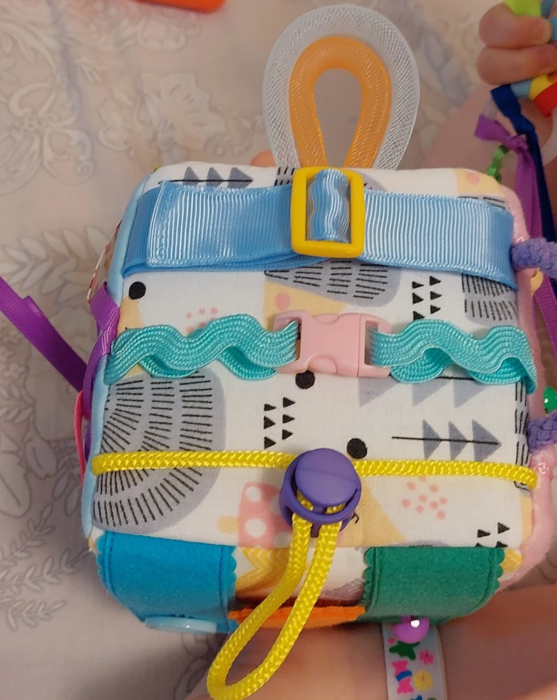 Бизиборд мягкий с ремешком для крепления, бизикубик игрушка с множеством застежек, бусин, лент, пуговок, шнуровки, замков и других элементов – незаменимая игрушка для развития моторики, внимания и усидчивости у детей раннего возраста. Такой яркий, необычный, познавательный кубик заинтересует ребенка с первого взгляда и станет любимой игрушкой на длительное время! Легко заменит пакет игрушек в длительном путешествии на автомобиле, самолете, поезде и других местах, когда необходимо, чтобы ребенок был занят. Это уникальный и полезный подарок, который точно понравится! Создан по методике раннего развития Марии Монтессори. Размер кубика 10*10 сантиметров, вес 100 гр. Рассчитан на возраст от 6 месяцев, НО только под присмотром взрослых! Дети играют с интересом до 3-4 лет. Наши развивающие игрушки ручной работы сделаны из натуральных, гипоаллергенных материалов высокого качества. Все игровые элементы надежно закреплены и крепко пришиты! Нет острых углов и полностью съемных деталей. Для износостойкости ткани проклеены хлопковым дублерином. Для большей мягкости граней внутри добавлен холлофайбер/синтепон. Это надежная и долговечная игрушка. Легко стирается (Рекомендации по уходу прилагаются). Примечание: цвета тканей и фурнитуры могут незначительно отличаться, что в целом не повлияет на готовое изделие. Все игрушки нашего Бренда созданы с душой и вниманием к каждой детали. Ручная работа.