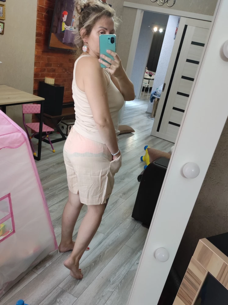 Шорты средней посадки. Длина до середины бедра. Широкая резинка будут хорошо держаться на любой фигуре. Дополнительно в поясе есть верёвочка для надёжной фиксации. В них можно заниматься спортом, бегать, ходить в походы – шорты не будут сковывать движения.