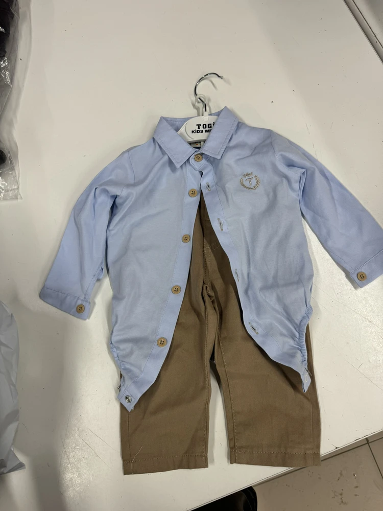 1. Рубашка-боди:Рубашка-боди выполнена из плотного слегка фактурного хлопкового материала. Эта рубашка-боди имеет контрастные пуговицы и металлические кнопки по низу, что облегчает ее надевание и снятие. Внутри рубашки-боди есть пройма для ног, которая помогает сохранить комфорт и свободу движений вашего малыша.
