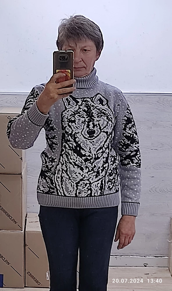 С этим новогодним женским свитером с волчьим рисунком вы не только будете выглядеть стильно и элегантно, но также почувствуете тепло и уют в холодные зимние дни.