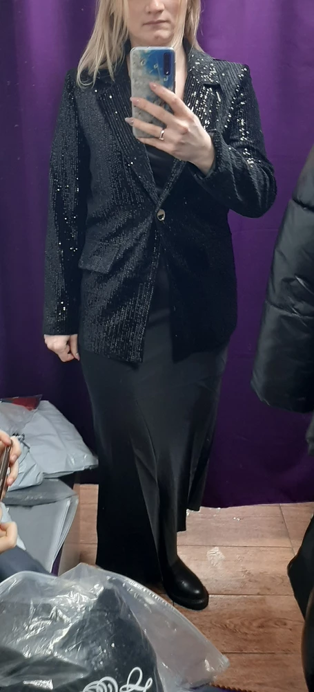 Пользователи отмечают, что пиджак с пайетками выглядит очень эффектно и нарядно. Этот элемент одежды привлекает внимание благодаря своему яркому и стильному дизайну, делая образ запоминающимся.