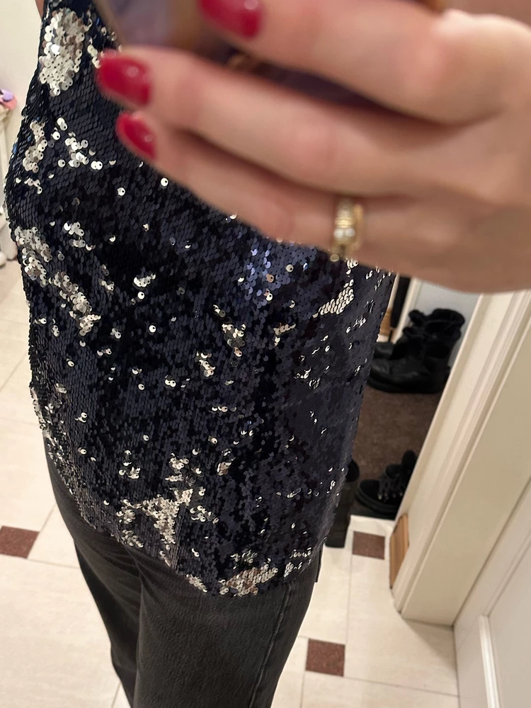 Расшит двухсторонними пайеткамиЭтот синий топик расшит двухсторонними пайетками, что позволяет им менять цвет и мерцать, создавая великолепный эффект. Блестки придадут вашему образу особую яркость и привлекательность.
