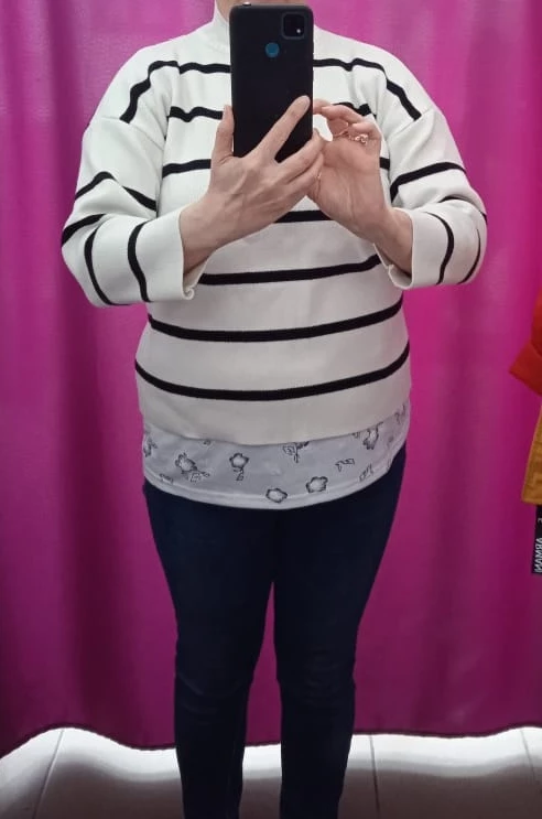 Идеальный выбор для будущих мамБлагодаря своему теплому и удлиненному дизайну, этот женский свитер идеально подходит для будущих мам на любом сроке беременности. Его свободный крой позволяет носить его с комфортом, а полосатый дизайн добавляет стильности.