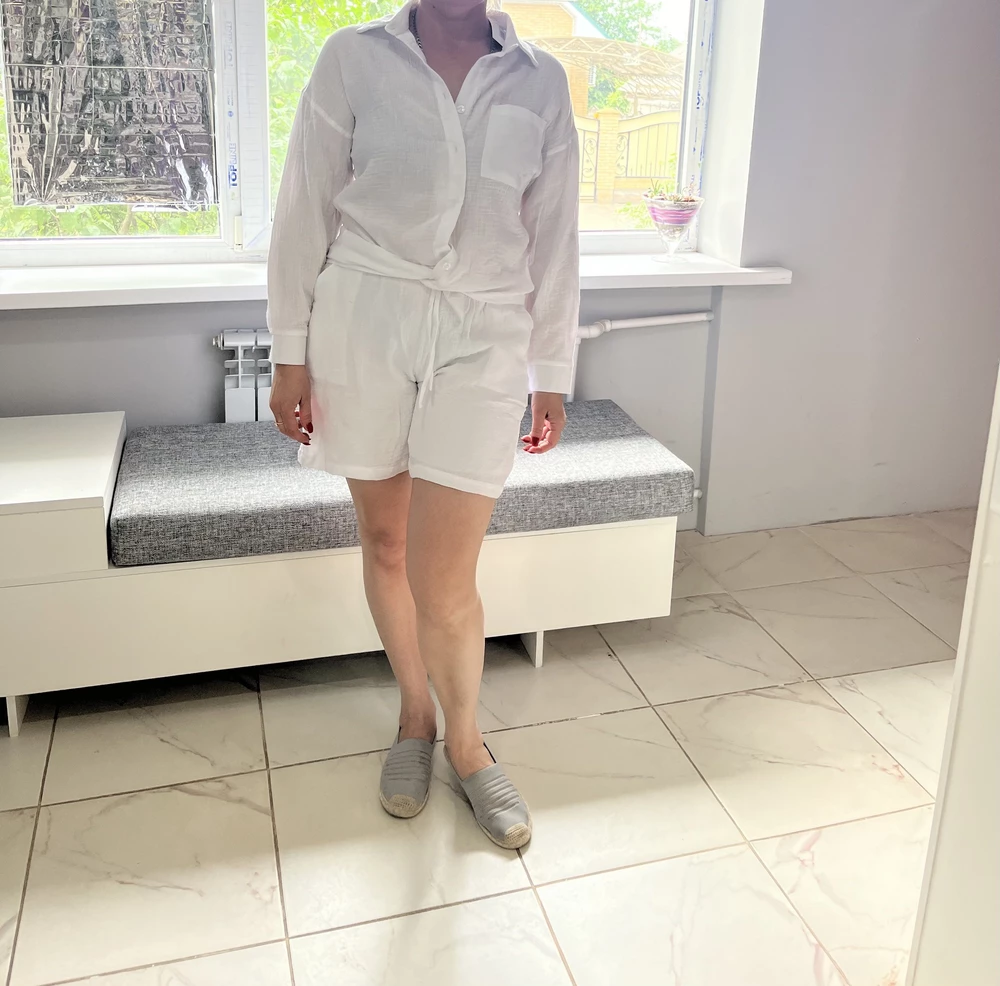 Шорты, выполненные из того же легкого муслина с эластичным поясом на резинке и завязками, сочетают в себе практичность и элегантность. Они идеально подчеркнут вашу фигуру и подарят ощущение полного комфорта в любой ситуации.