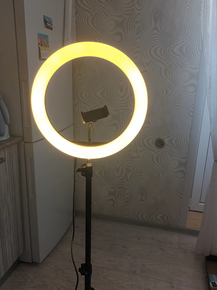 Кольцевая лампа имеет 12 уровней яркости, 3 стандартных белых режима и 49 цветных режимов: 7 статических и множество динамичных вариаций. Предмет с штативом и RGB светом подходит для всех кто хочет улучшить свои фотографии и видео а так же станет отличным подарком на Новый год и день рождения. Хороших покупок!