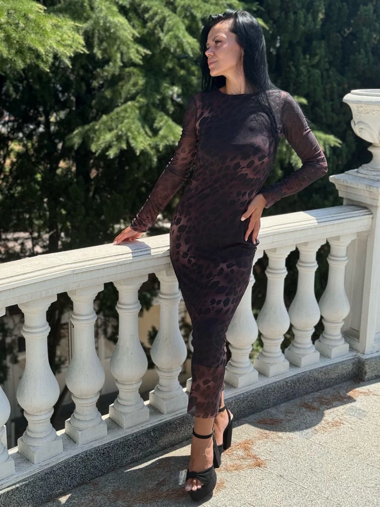 Платье из черной сетки с леопардовым принтом и длинным рукавом создано для красивых женщин. Оно прямое, но обтягивающее фигуру, идеально подчеркивая изгиб линии талии. Необычное сочетание сетки и леопардового принта делает это платье макси идеальным выбором для стильных дам, желающих выглядеть эффектно и модно.