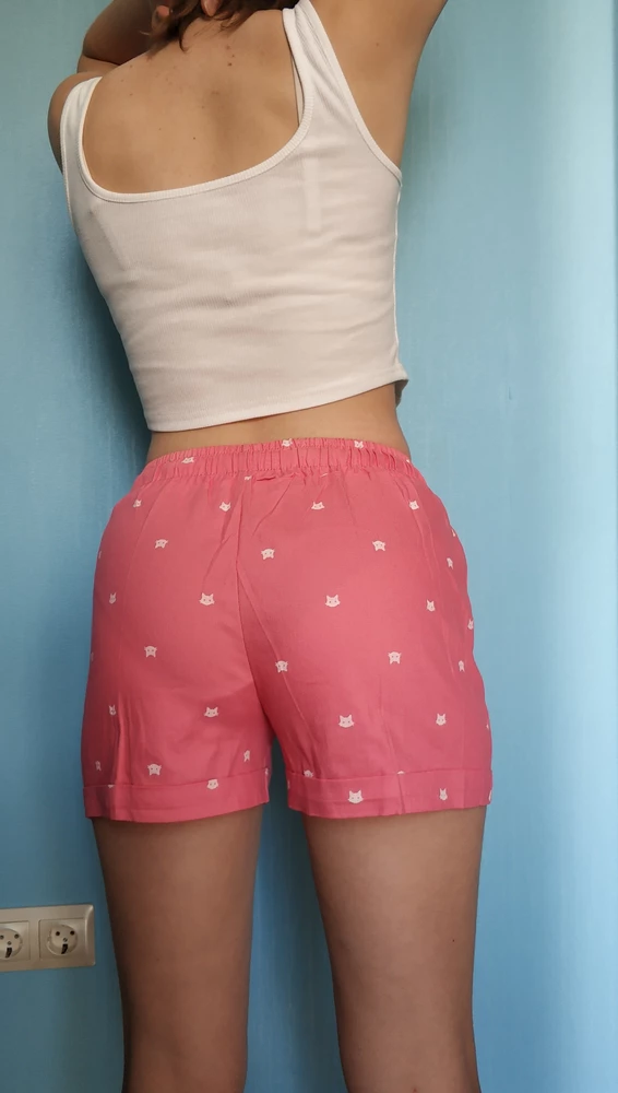 Шорты средней посадки. Длина до середины бедра. Широкая резинка будут хорошо держаться на любой фигуре. Дополнительно в поясе есть верёвочка для надёжной фиксации. В них можно заниматься спортом, бегать, ходить в походы – шорты не будут сковывать движения.