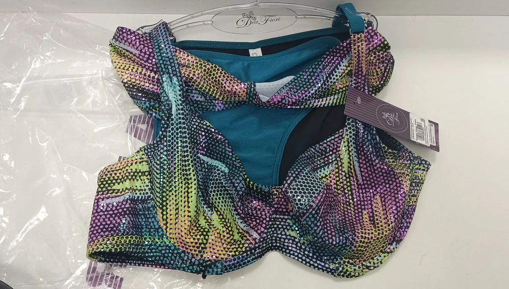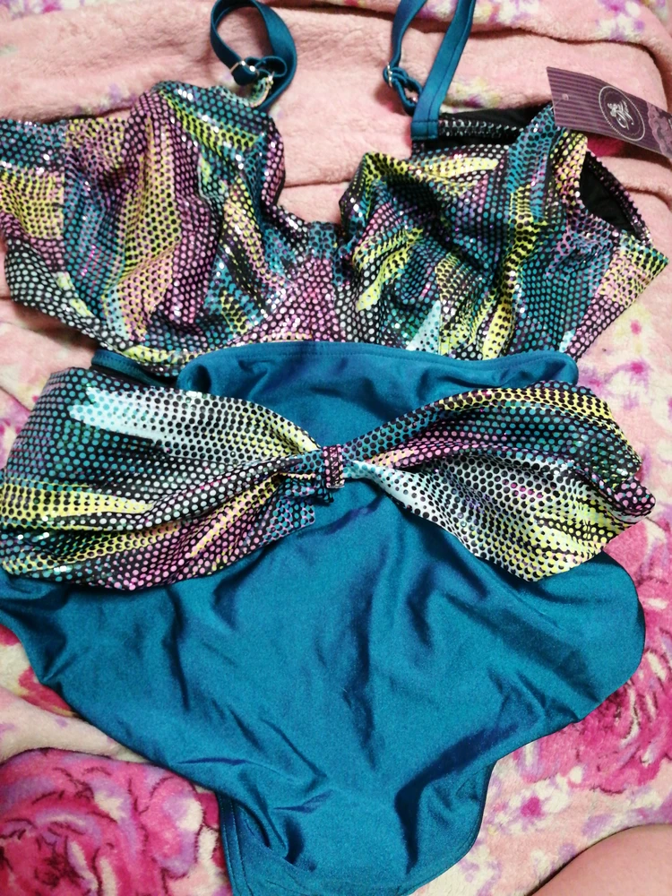 Мягкая чашка на каркасах. В боковых деталях использованы пластины упругости. Внутренняя поверхность чашки дублирована неэластичной сеткой, что позволяет иметь в большом размере идеальную посадку. Плавки со средней линией бедра, украшены драпированным в центре пояском. Сочетание сверкающего принта с мерцающим темно-бирюзовым, входящим в топ модных цветов сезона, позволит сиять и чувствовать себя звездой на любом пляже мира!
