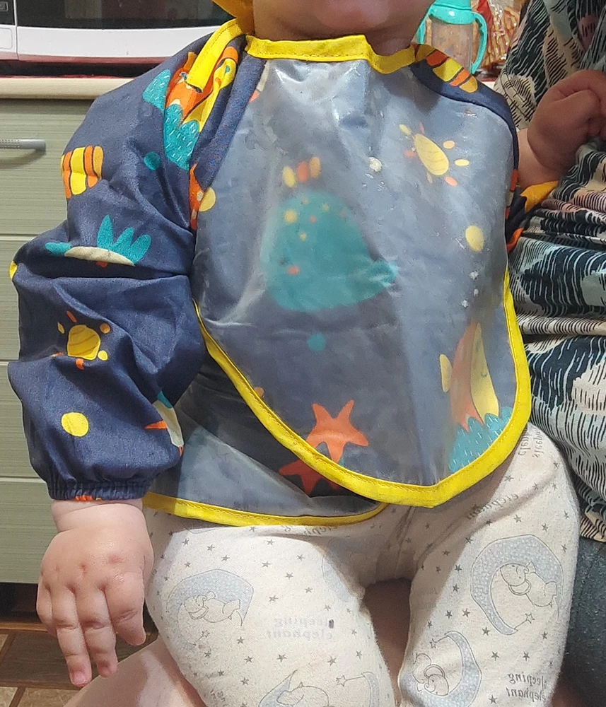 Нагрудник для кормления, творчества и рисования детский станет незаменимым помошником для мамы и детей. Слюнявчик нагрудник отлично подходит для новорожденных и малышей от 0 до 3 лет. Нагрудник с карманом отлично защищает малыша и его одежду от попадания пищи и воды во время кормления, рисования или занятия творчеством: водных игр, лепки из пластилина и многих других интересных занятий. Передняя часть нагрудника фартука изготовлена из непромокаемой качественной ткани. Нагрудник послужит отличной альтернативой силиконовым нагрудникам. Слюнявчик с рукавами и карманом имеет длинные рукава с резинкой, которые помогают дополнительно защитить руки ребенка во время кормления или творчества. Нагрудник детский удобен в эксплуатации и легко стирается. Нагрудник максимально прост в одевании и снимании за счет удобной застежки сзади.
