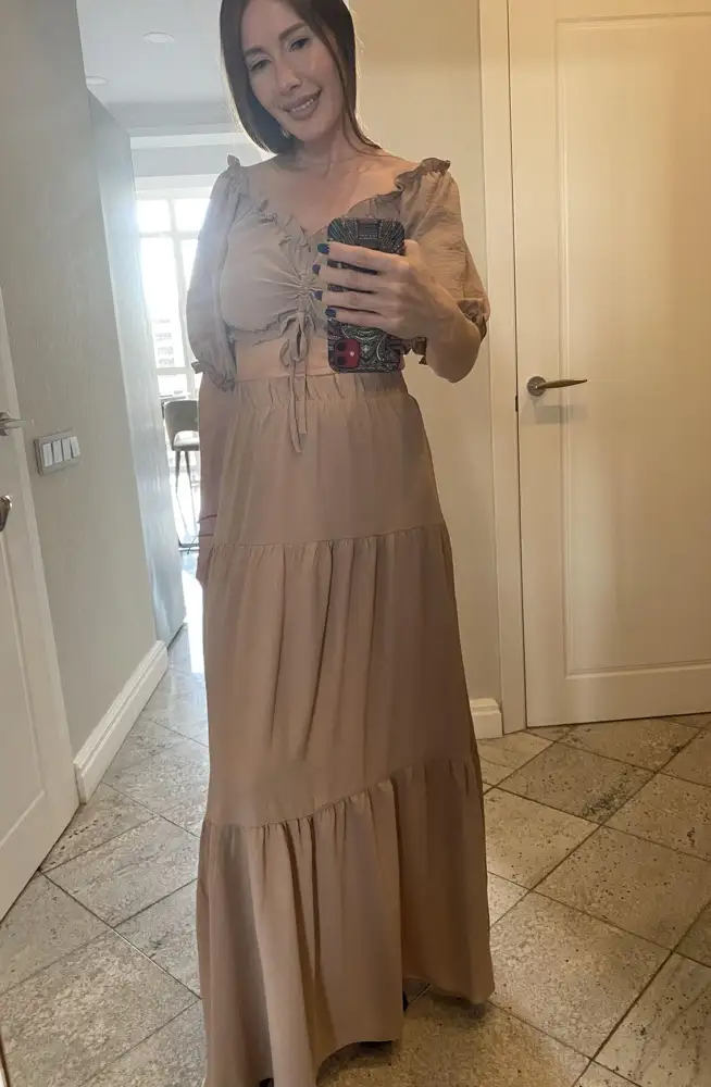Я в восторге от этого костюма,это определенно теперь мой фаворит на лето!!!Хотелось бы отметить качество изделия и ткань,она одновременно и легкая и плотная,за счёт  чего юбка при ходьбе струится под тяжестью полотна.Сам образ настолько женственный,что я чувствую себя в нем просто королевой)))Ношу S ,размер подошёл.Выбирала между бежевым и чёрным,в итоге хочу теперь ещё чёрный комплект заказать,уже придумала кучу образов)И ещё классная фишка,что плечи можно спускать и поднимать и регулировать завязки,можно затягивать завязки топ будет смотреться короче а можно чуть шире….Вообщем я очень рада своей покупке!!!!
